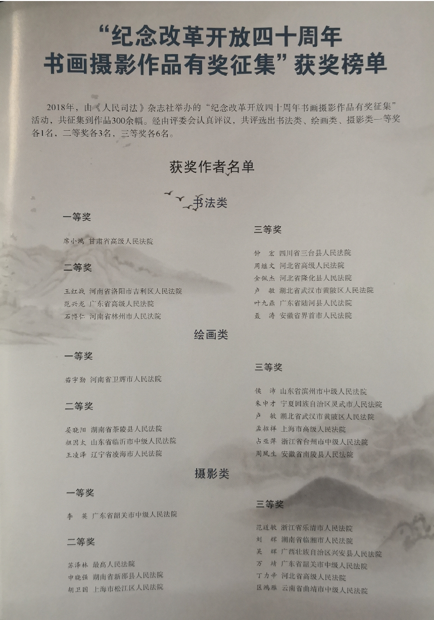 2018年,《人民司法》杂志举办了“纪念改革开放四十周年书画摄影作品有奖征集”活动,省法院书画协会、摄影协会发动全省法院书画摄影爱好者积极参加。近日,该活动获奖榜单揭晓,我省法院共获得一等奖1名,二等奖1名,三等奖2名,获奖数量位居全国首位。