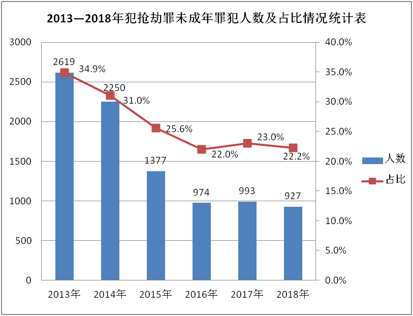 六年间,犯抢劫罪的未成年罪犯人数及其占全省未成年罪犯人数的比例明显下降。其中,2018年犯抢劫罪的未成年罪犯人数较2013年减少64%以上,占比下降近13个百分点。