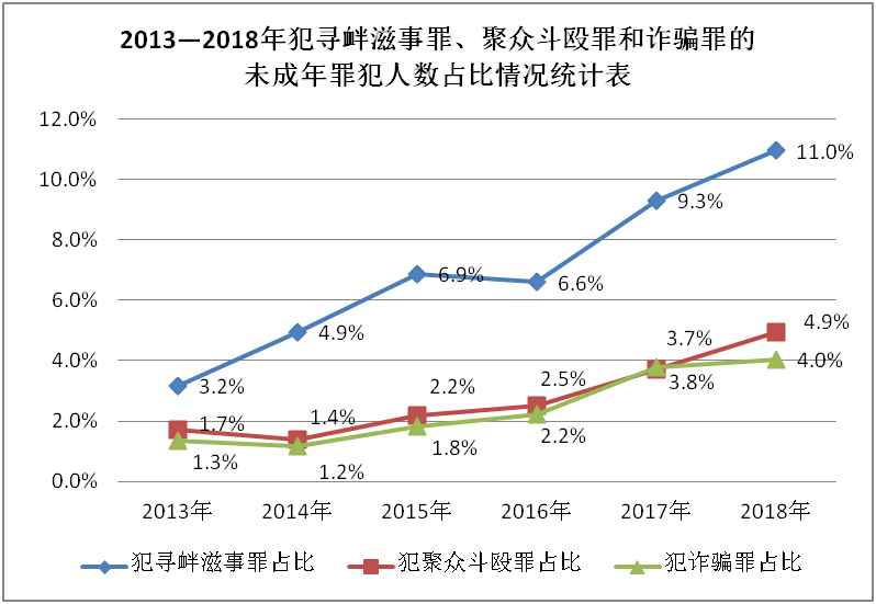 另外,需警惕的是,犯寻衅滋事罪、聚众斗殴罪、诈骗罪的未成年罪犯人数及占比均呈上升趋势。其中,2018年犯寻衅滋事罪的未成年罪犯人数较2013年增加92%,占比上升近8个百分点;犯聚众斗殴罪的未成年罪犯人数增加近61%,占比上升逾3个百分点;犯诈骗罪的未成年罪犯人数增加68%,占比上升近3个百分点。
