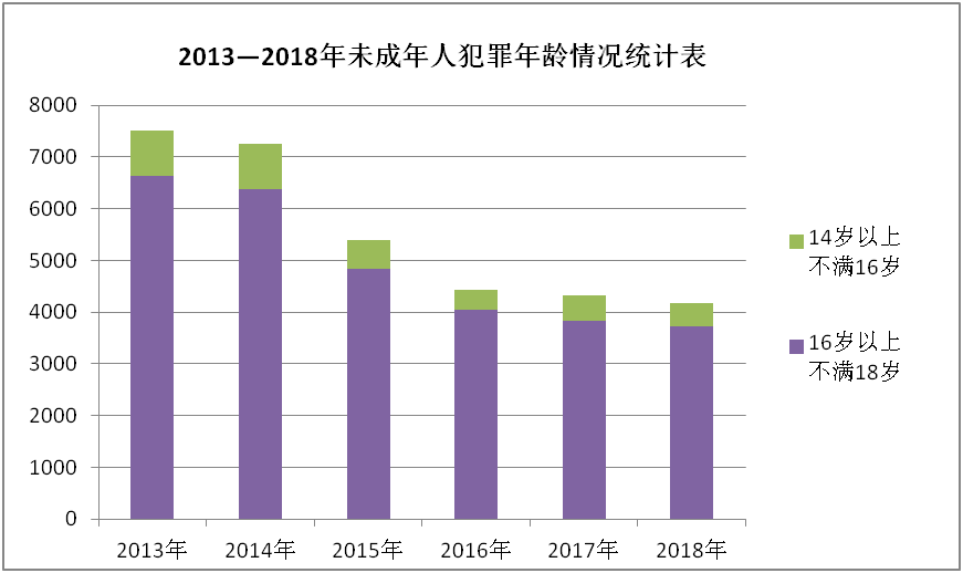 16周岁以上不满18周岁仍是未成年人犯罪的高发年龄段,2013至2018年该年龄段的未成年罪犯共29468人,占全省未成年罪犯的89.1%。14周岁以上不满16周岁的未成年罪犯人数下降明显,其占未成年罪犯的比重亦呈曲折下降趋势,未成年人犯罪低龄化势头基本得到遏制。