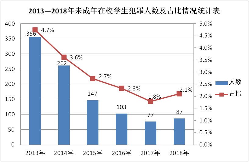 2013至2017年期间未成年在校学生犯罪人数及其占同期全省未成年罪犯人数的比例均较前一个五年明显下降,且人数及占比均呈逐年下降的趋势。而2018年在校学生犯罪人数及其占比虽略有反弹,但与2013年相比,人数和占比下降幅度依然相当明显。其中,人数下降逾75%,占比减少2.6个百分点。