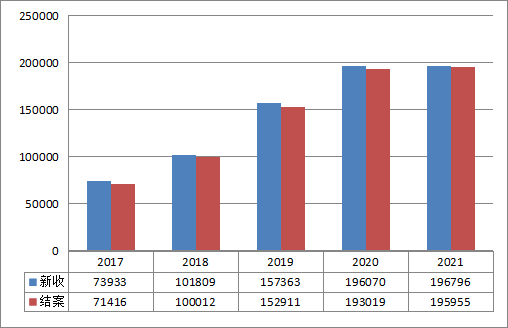 2021年,全省法院新收各类知识产权案件196796件,同比增长0.37%;审结195055件,同比增长1.06%。其中,新收一审案件173637件,同比减少1.99%;二审案件21123件,同比增长19.21%;申请再审案件1971件,同比增长73.66%;再审案件65件,同比增长20.37%。