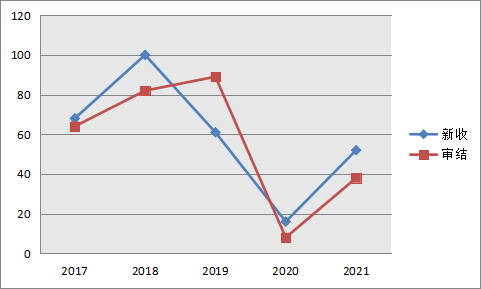 图5:近五年成人小说网 新收、审结行政案件数量