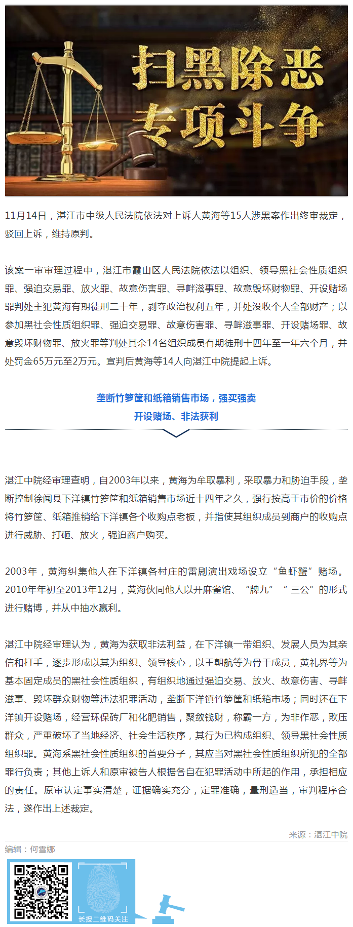湛江中院对黄海等15人涉黑案作出终审裁定